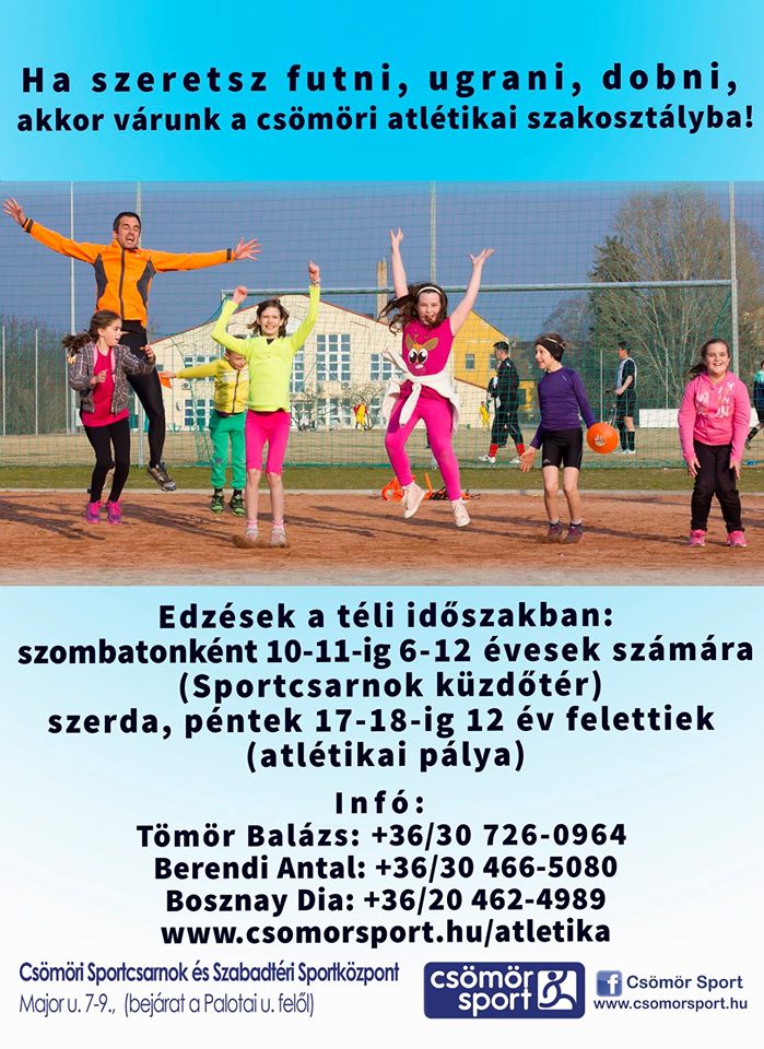 Idén, azaz 2016-ban is várjuk a gyermekeket a csömöri atlétikai szakosztályba! Ha szeretsz futni, ugrani, dobni akkor téged is várunk az atlétikai pályán! Az edzéseket a téli időszakban a sportcsarnok küzdőterén tartjuk!