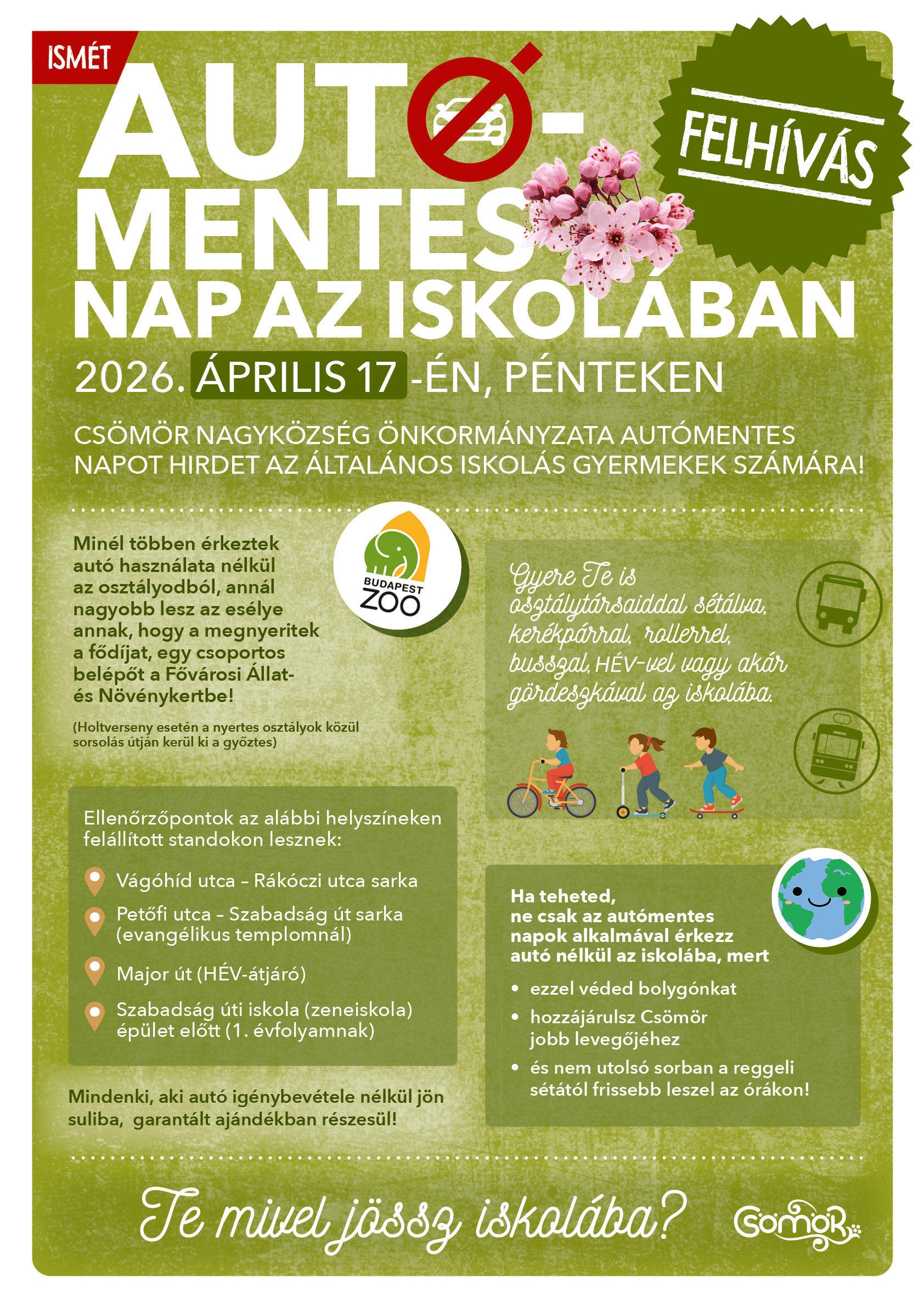 Csömör Nagyközség Önkormányzata 2026. április 17-re, péntekre ismét autómentes napot hirdet az általános iskolába járó gyermekek számára! Az autó nélkül érkező gyermekek garantált ajándékban részesülnek!