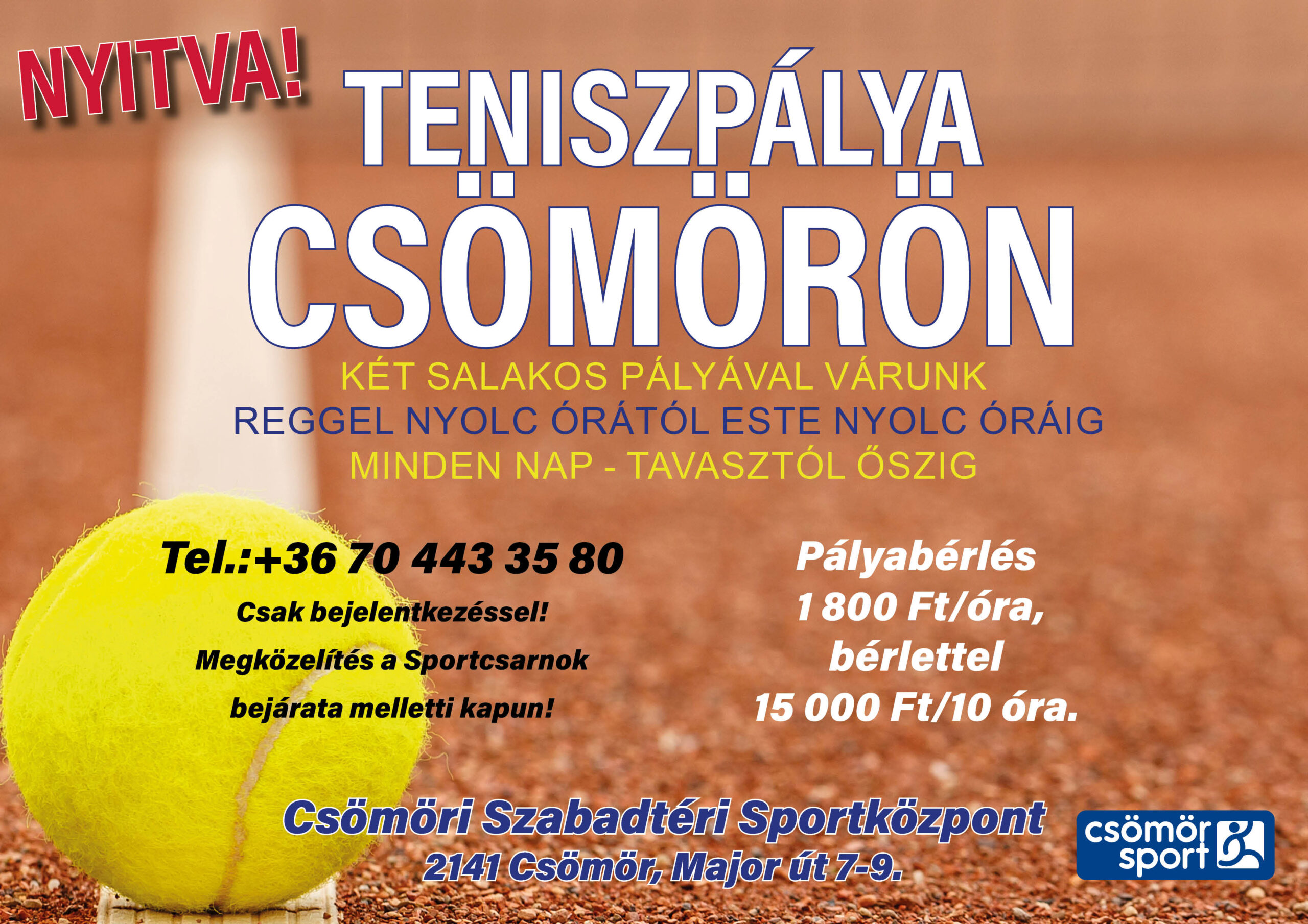 Ahogy éledezik a tavaszi időjárás, úgy válnak egyre aktívabbá a salakpályás tenisz szerelmesei! A csömöri pálya borításának karbantartása megtörtént, a hálók a helyükre kerültek, így a létszámlimit megtartása mellett ismét használhatóak a pályák!