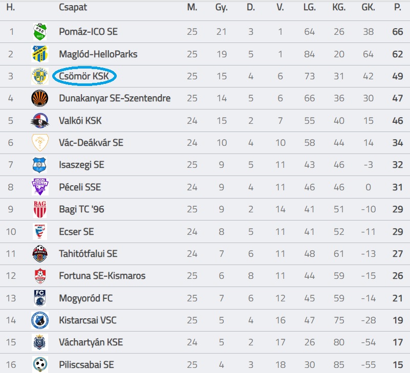 Hogy a dupla előny ne okozzon hamis biztonságérzetet, arról megint Czakó gondoskodott a második játékrész elején, majd az 57. percben Dencz értékesítette magabiztosan a megítélt büntetőt. Ekkor már négygólos volt a csömöri előny, a cserék után azonban változott a játék képe. Felbátorodtak a kismarosiak, az erejükből viszont csak a szépítésre futotta. A 90. percben aztán Czakó tette fel a koronát a teljesítményére, csodálatos tekerés után szerezte meg negyedik gólját – ezzel 21 találatával előrelépett a góllövőlista második helyére. A csapat jelenleg a bronzérmet jelentő harmadik helyen áll.