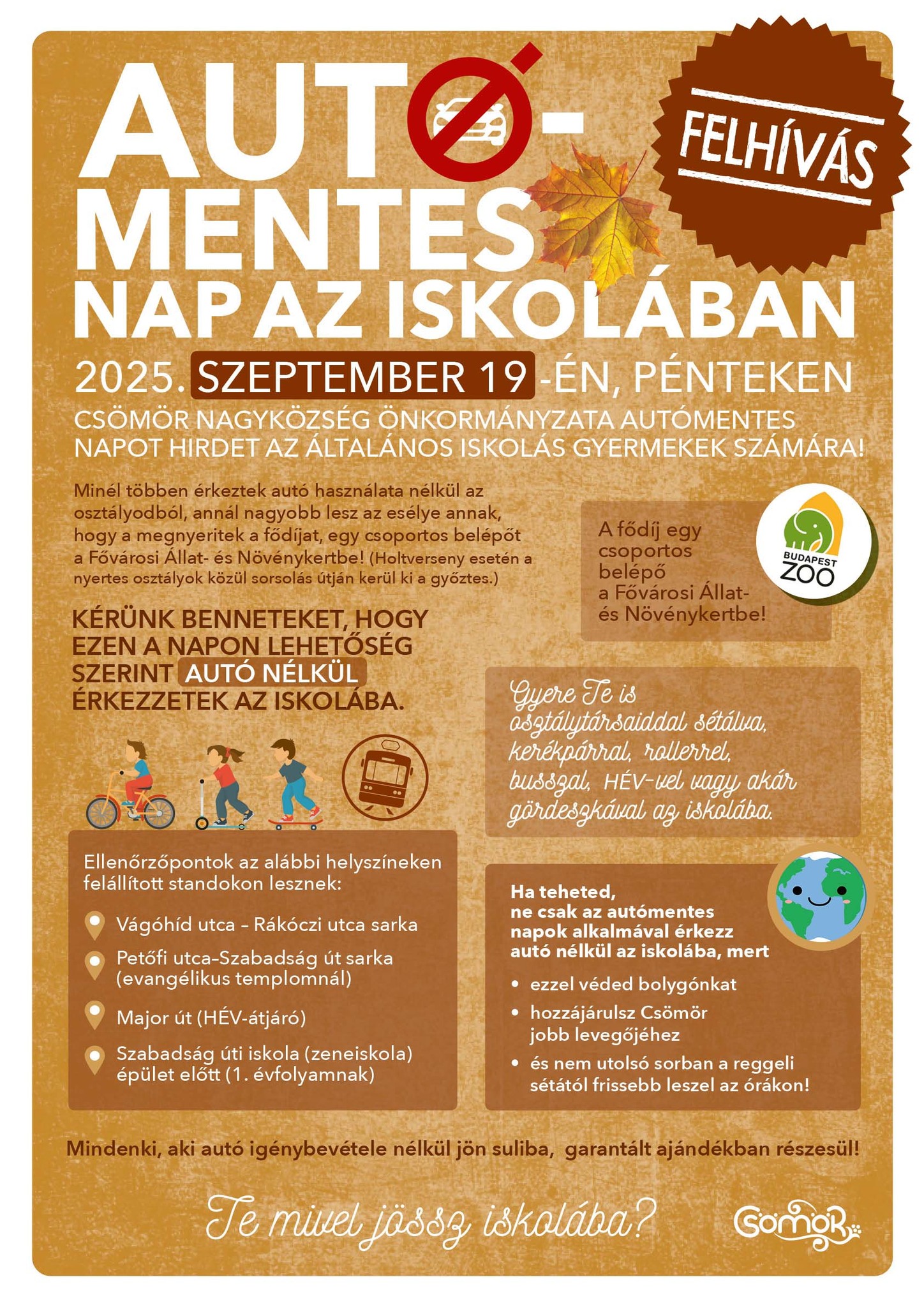 Ismét autómentes nap Csömörön Csömör Nagyközség Önkormányzata 2025. szeptember 19-re, péntekre ismét autómentes napot hirdet az általános iskolába járó gyermekek számára! Az autó nélkül érkező gyermekek garantált ajándékban részesülnek! Peter2025-09-15T20:18:32+02:002025.09.16.|ÁLTALÁNOS| Oszd meg, válassz platformot! FacebookXRedditLinkedInWhatsAppTelegramTumblrPinterestVkXingEmail: Ajánlott bejegyzések Autómentes nap Csömörön Galéria Autómentes nap Csömörön Nyári sporttáborok Csömörön Galéria Nyári sporttáborok Csömörön Boldog húsvétot kívánunk! Galéria Boldog húsvétot kívánunk! Vadonatúj eredményjelző Galéria Vadonatúj eredményjelző