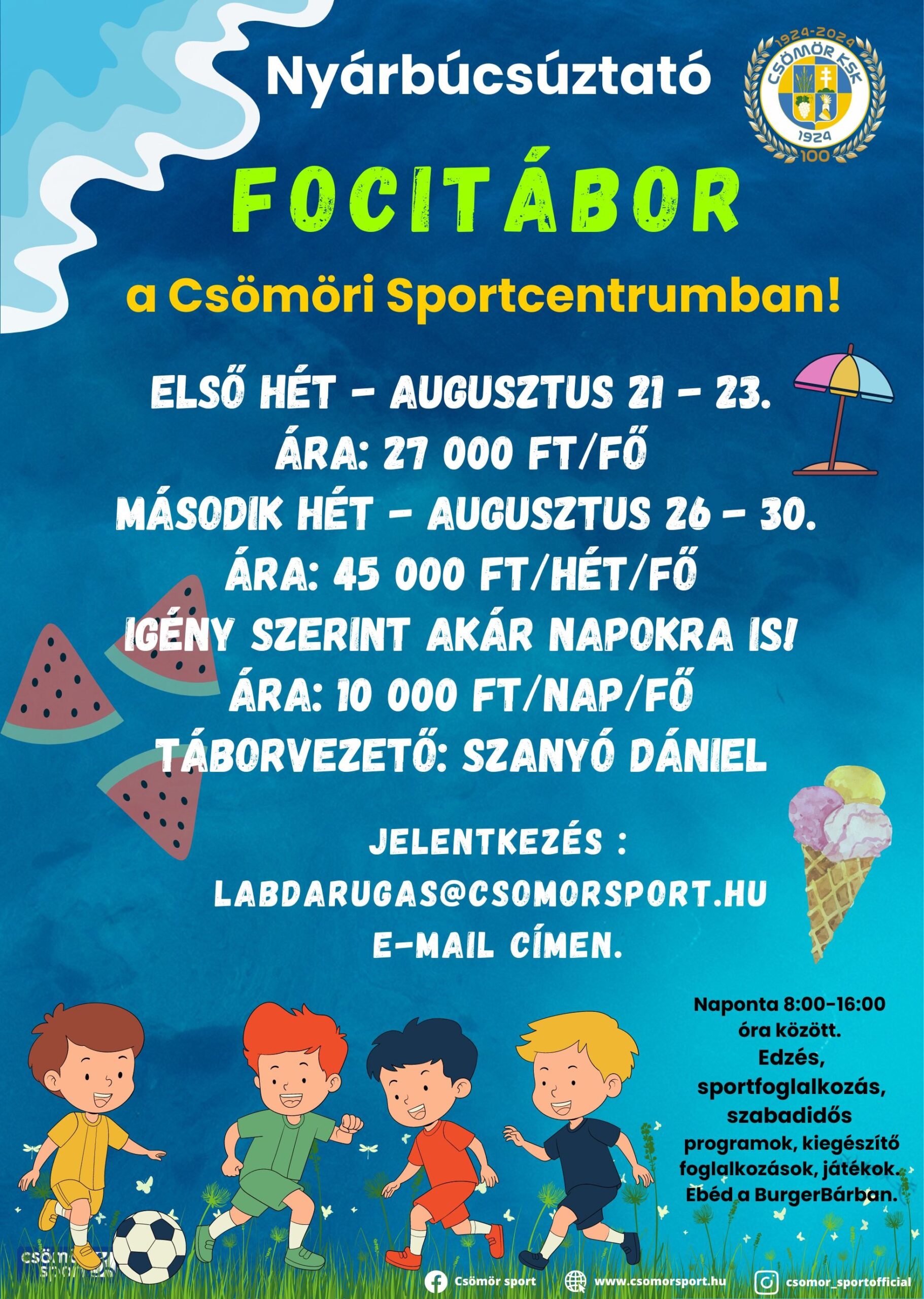 A tábor naponta 9-16 óra között zajlik. Edzés, sportfoglalkozás, szabadidős programok, kiegészítő foglalkozások, játékok. Ellátás: ebéd a Burger Bárban. A táborokat minimum 12 fő jelentkezése esetén tartjuk meg. Mindenkit szeretettel várunk, nem feltétel a Csömör KSK-tagság! Bővebb információ, jelentkezés a lenti elérhetőségeken! Helyszín: Csömöri Szabadtéri Sportközpont.