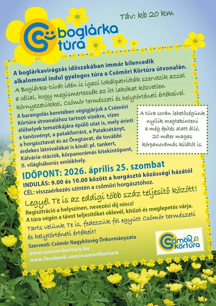 Szombaton újra Boglárka-túra! A hagyományoknak megfelelően idén tavasszal is sor kerül a Boglárka-túra elnevezésű közösségi gyaloglásra a Csömöri Körtúra útvonalán, amely az ilyenkor virágzó boglárkáról kapta a nevét. Érdemes csatlakozni, a szervezők várják a lelkes túrázókat! Peter2026-04-20T11:26:38+02:002026.04.20.|ÁLTALÁNOS| Oszd meg, válassz platformot! FacebookXRedditLinkedInWhatsAppTelegramTumblrPinterestVkXingEmail: Ajánlott bejegyzések Autómentes nap Csömörön Galéria Autómentes nap Csömörön Nyári sporttáborok Csömörön Galéria Nyári sporttáborok Csömörön Boldog húsvétot kívánunk! Galéria Boldog húsvétot kívánunk! Vadonatúj eredményjelző Galéria Vadonatúj eredményjelző