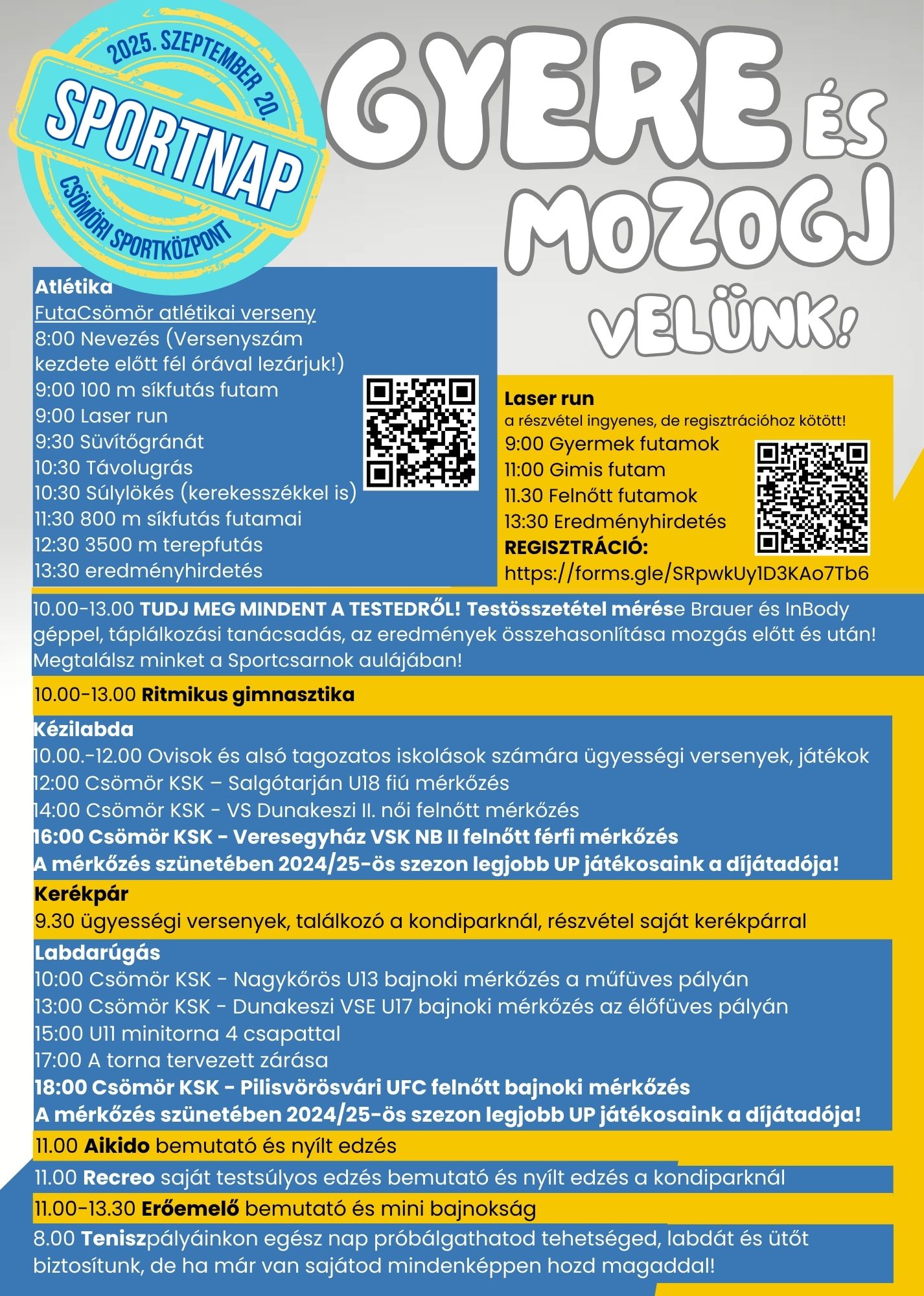 Szeptember 20-án szombaton nagyszerű programokkal, ingyenes mérésekkel, népszerű sportágakkal várjuk a csömöri Sportnap látogatóit, az atlétikától, a focin, a kézilabdán és a karatén át egészen a teniszig a Csömöri Szabadtéri Sportközpontban és Sportcsarnokban – másnap pedig a Palotai úti parkolóból induló családbarát kerékpáros körtúra várja a lelkes érdeklődőket! Íme, a program: