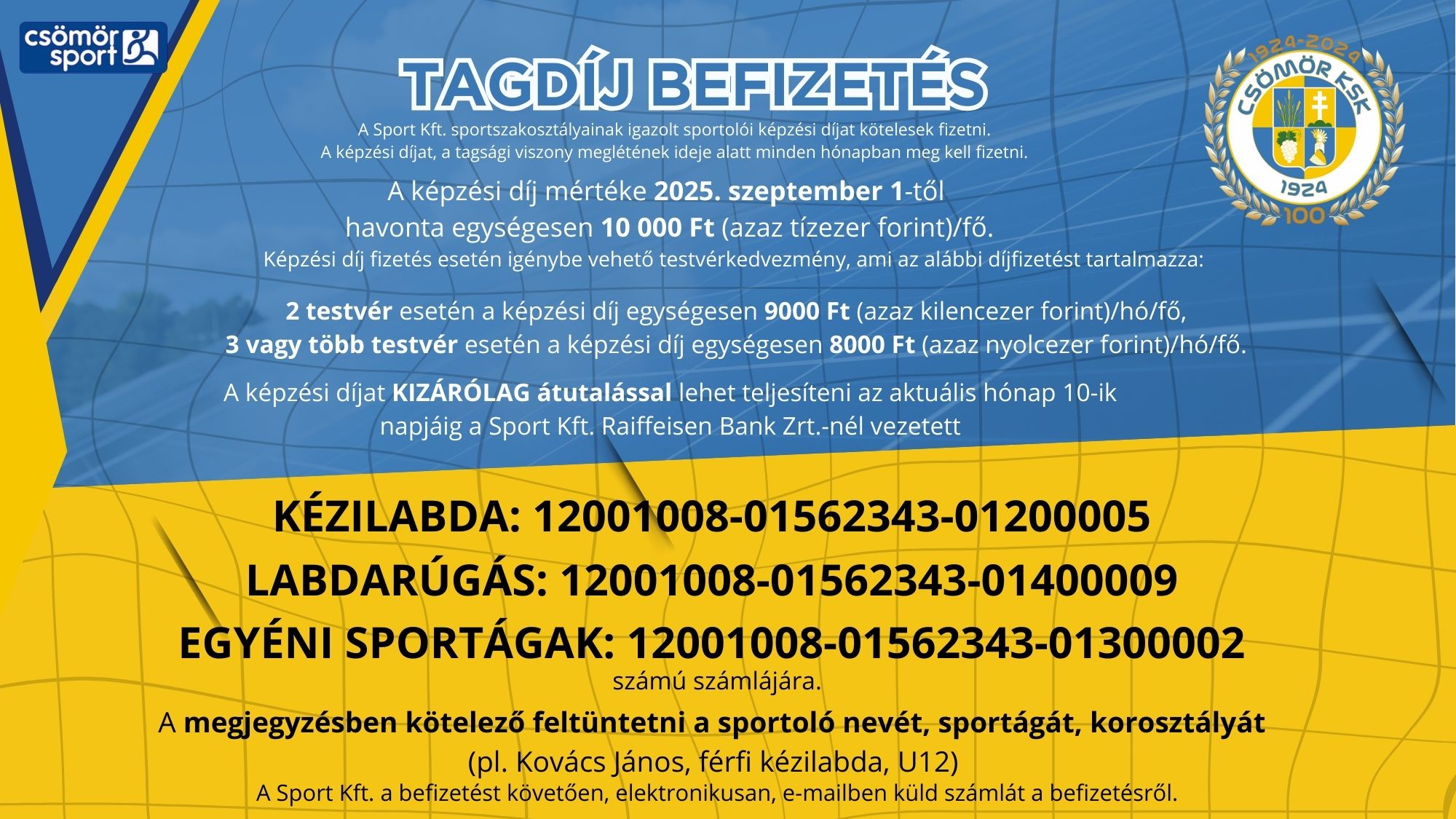Fontos változás történt a Csömöri Sport és Szabadidő-szervező Kft. által kezelt tagdíjbefizetési rendszerben. Szeptembertől a Csömör KSK képzési díjait (sportolói tagdíj) kézilabdázóink, labdarúgóink és egyéni sportolóink, illetve szüleik elkülönített számlaszámra utalhatják!